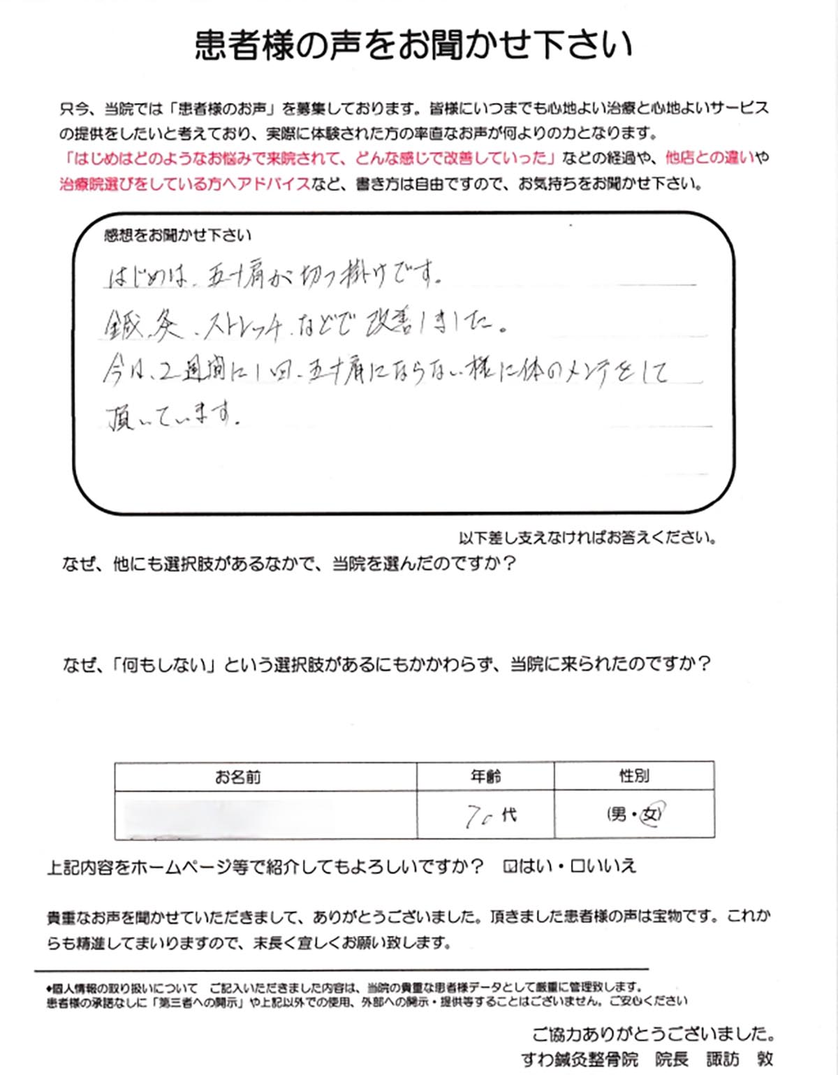 | 「色々な面からアプローチしてくれる施術方針を信頼しています!」