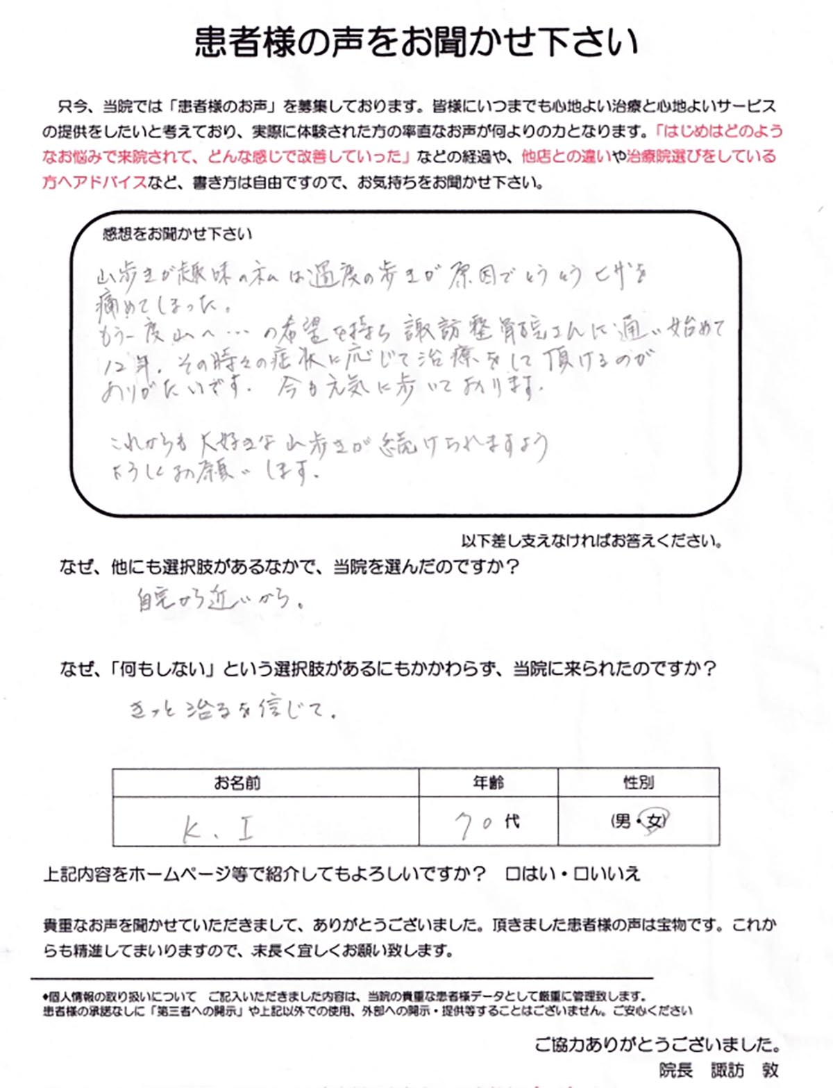 四年程前から股関節が痛く、三年前に手術して二年前ぐらいから、腰、膝が悪くなり、歩行が辛くなり、両つえで歩行していましたが、なんとか杖なしで歩けるようにと思っていた時、チラシが入り、思い切って来院しました。施術がすむと体が少し楽でしたので続けました。24回施術してもらい、体も大分楽になり希望がもてると思い、もう少し続けようと思います。 (80代女性 F・H様) ※効果には個人差があります |