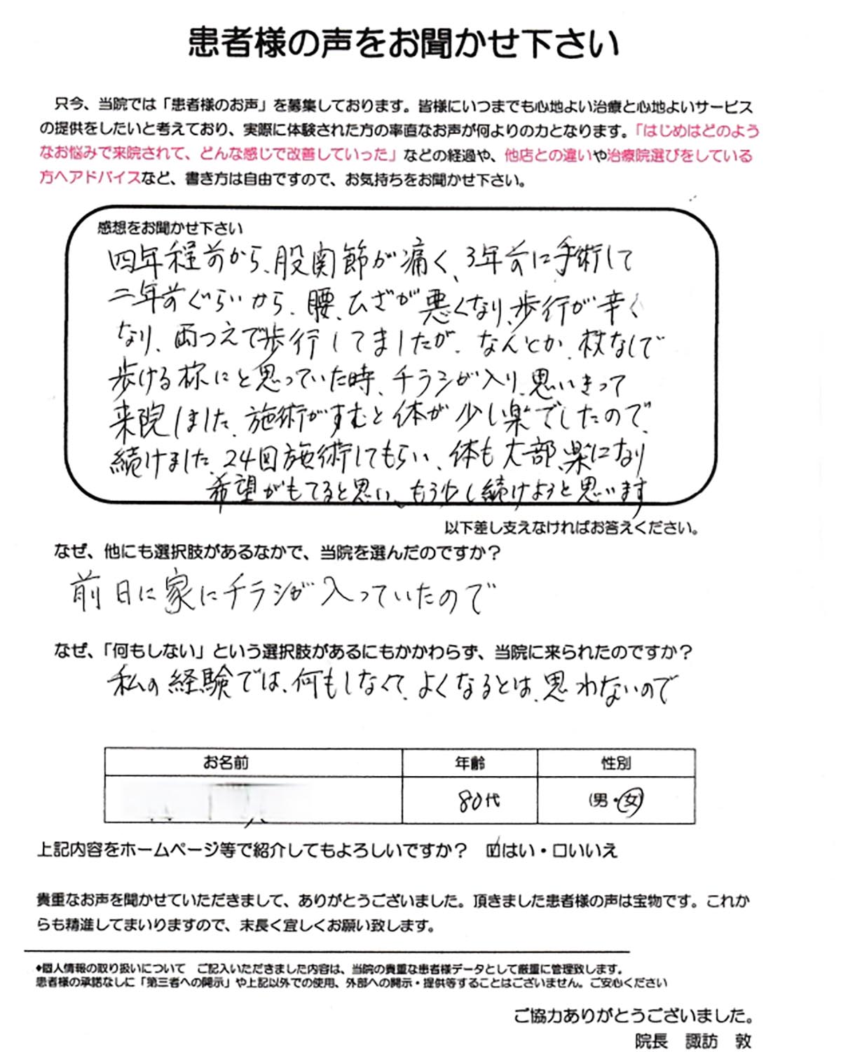 四年程前から股関節が痛く、三年前に手術して二年前ぐらいから、腰、膝が悪くなり、歩行が辛くなり、両つえで歩行していましたが、なんとか杖なしで歩けるようにと思っていた時、チラシが入り、思い切って来院しました。施術がすむと体が少し楽でしたので続けました。24回施術してもらい、体も大分楽になり希望がもてると思い、もう少し続けようと思います。 (80代女性 F・H様) ※効果には個人差があります |