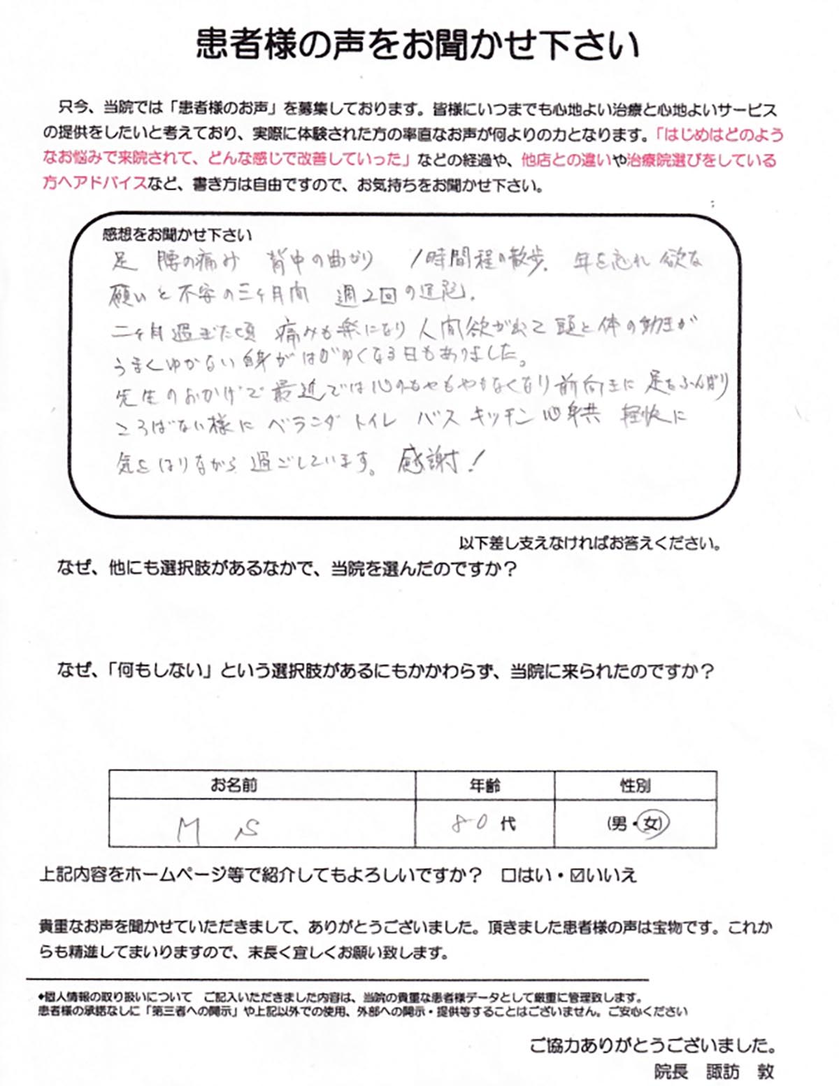 足、腰の痛み、背中の曲がり。1時間程の散歩、年を忘れ欲な願いと不安の三ヶ月間、週2回の通院。 (80代女性 M・S様) ※効果には個人差があります |