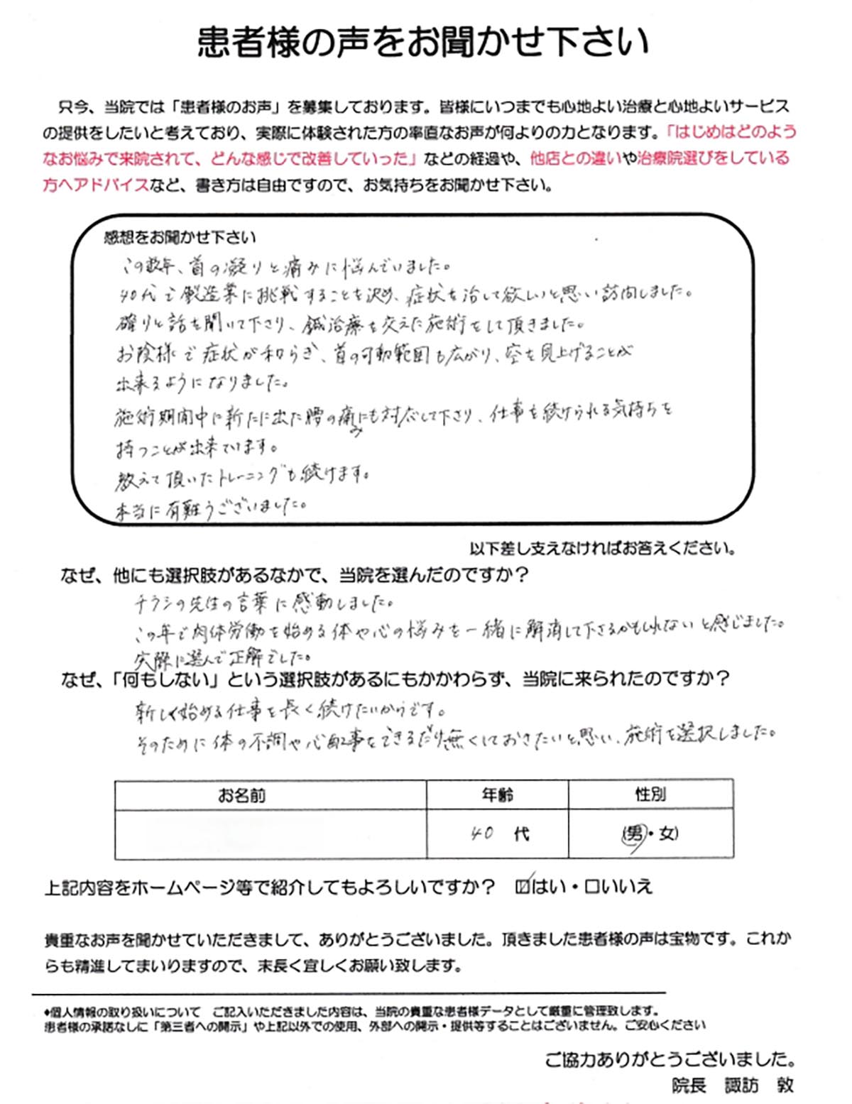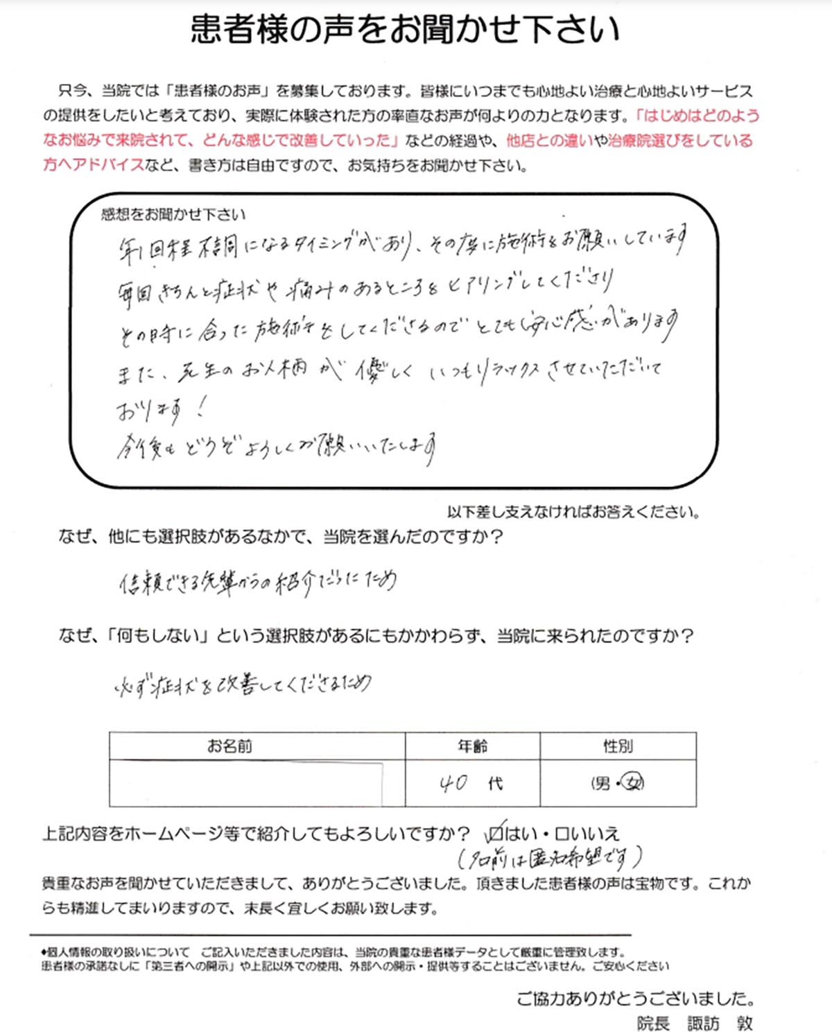 | 「色々な面からアプローチしてくれる施術方針を信頼しています!」