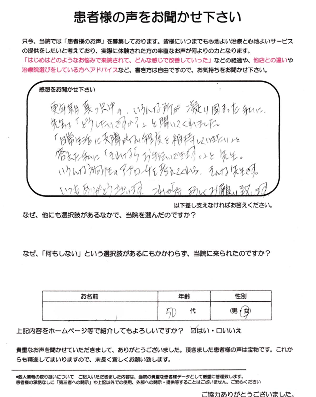 更年期真っ只中の、いろんな所が凝り固まった私に、先生は「どうしたいですか?」と聞いてくれました。 (50代女性 匿名希望) ※効果には個人差があります |