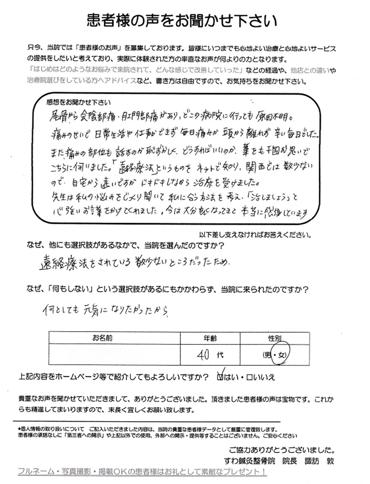 鼻骨から会陰部痛・肛門部痛があり、どこの病院に行っても原因不明。痛みのせいで日常生活や仕事ができず、毎日痛みが頭から離れず辛い毎日でした。また、痛みの部位も話すのが恥ずかしく、どうすればいいのか、藁をも掴む思いでこちらに伺いました。「遠絡療法」というものをネットで知り、関西では数少ないので自宅から遠いですが、ドキドキしながら施術を受けました。 (40代女性 N・S様) ※効果には個人差があります |