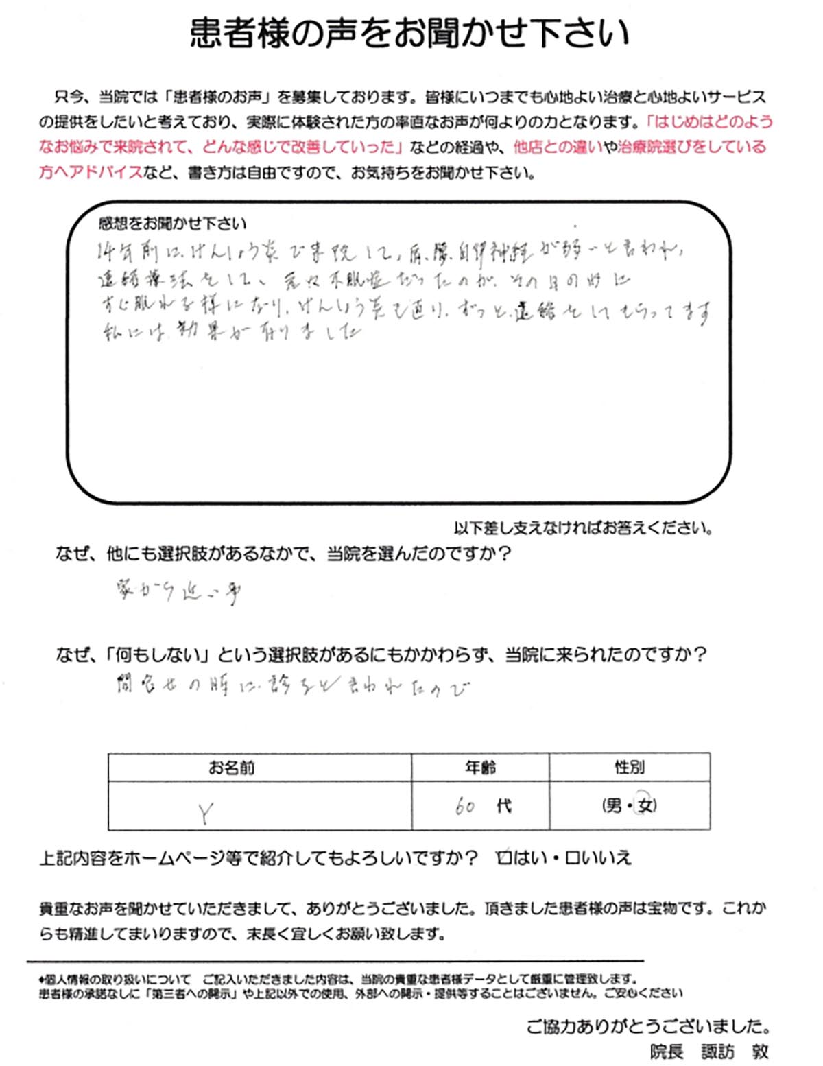 R5年9月20日に左腕の帯状疱疹を発症。ところが後遺症として神経痛が残ったので、10月9日近くの鍼灸院で初めての鍼を受けたところ、鍼灸跡に蕁麻疹が発症しましたので鍼灸施術を断念しました。神経痛による疼痛は一ヶ月半ほど皮膚科処方の内服薬を飲んでも痛みは消えませんでした。そして、ネットで遠絡療法という方法があるのを知り、大津市から一番近い施術院だったのが、ここ「すわ鍼灸整骨院」でした。11月6日から遠絡療法とレーザーとお灸で蕁麻疹も起きないことを確認し、施術開始後2週間(4~5回施術)ほどから疼痛は徐々に消え始め、更に1ヶ月後(通算10回施術)には親指と人差し指の若干の痺れと時々の痛み以外は解消し、ほぼ以前の日常生活に戻ることが出来ました。一回一回の施術後に顕著な変化は感じなかったのですが、回を重ねることで確実に痛みは良化しておりました。熱心に施術して頂いた当整骨院の諏訪院長には深謝しております。 (70代男性 T・H様) ※効果には個人差があります |