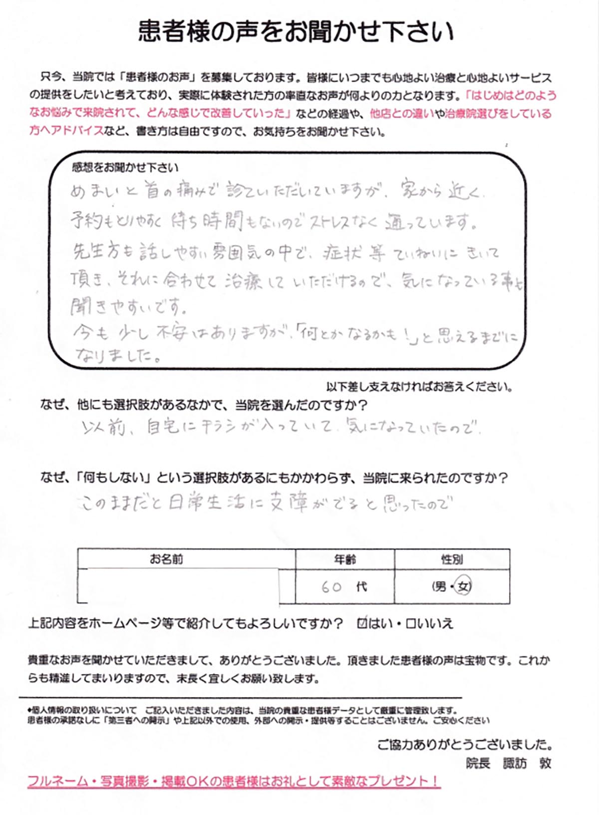 めまいと首の痛みでみていただいていますが、家から近く、予約も取りやすく待ち時間もないので、ストレスなく通っています。先生方も話しやすい雰囲気の中で、症状等丁寧に聞いていただき、それに合わせて施術していただけるので、気になっている事も聞きやすいです。 (60代女性 M・M様) ※効果には個人差があります |