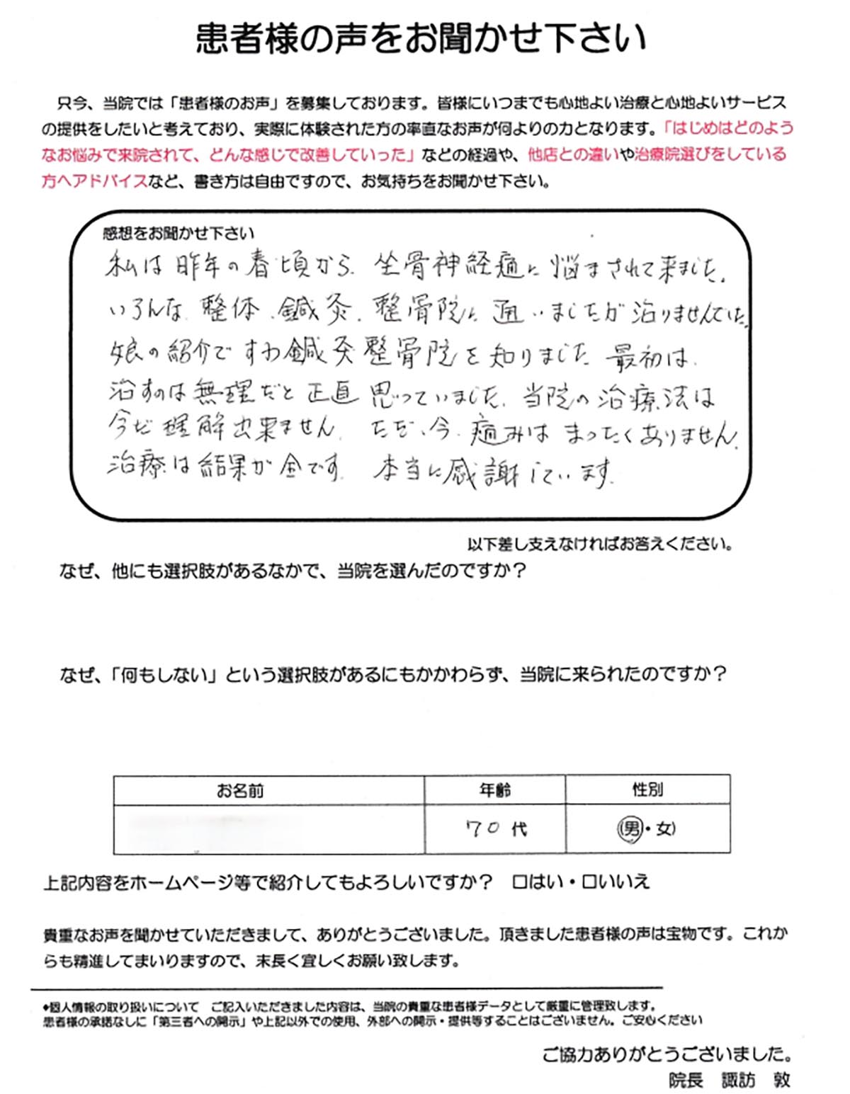 私は昨年の春頃から坐骨神経痛に悩まされてきました。いろんな整体、鍼灸、整骨院に通いましたが治りませんでした。娘の紹介で、すわ鍼灸整骨院を知りました。最初は、改善するのは無理だと正直思っていました。当院の治療法はいまだ理解できません。ただ、今痛みはまったくありません。治療は結果が全てです。本当に感謝しています。 (70代男性 K・O様) ※効果には個人差があります |